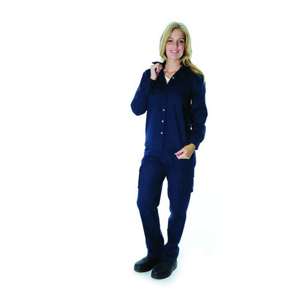 190gsm cotton drill, full open front with twin flap pocket Available in Navy only.