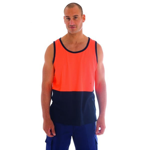 185gsm polyester outer/cotton back (extra cool and breathable) HiVis two tone singlet, contrast binding, two tone front and back. Upper fabric complies with HiVis Standards of AS/NZS1906.4:1997.